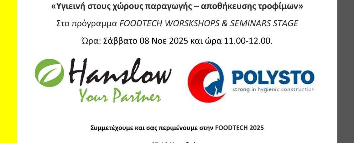 Συμμετείχαμε στην Έκθεση Foodtech 2025 στις 07~ 10 Νοεμβρίου, στο Metropolitan Expo. Παρουσιάσαμε στους επισκέπτες μας τα προϊόντα της Polysto Group καθώς και τις Υγειονομικές εφαρμογές στη Βιομηχανία Τροφίμων. Στα πλαίσια της έκθεσης και στο πρόγραμμα FΟΟDΤΕCΗ